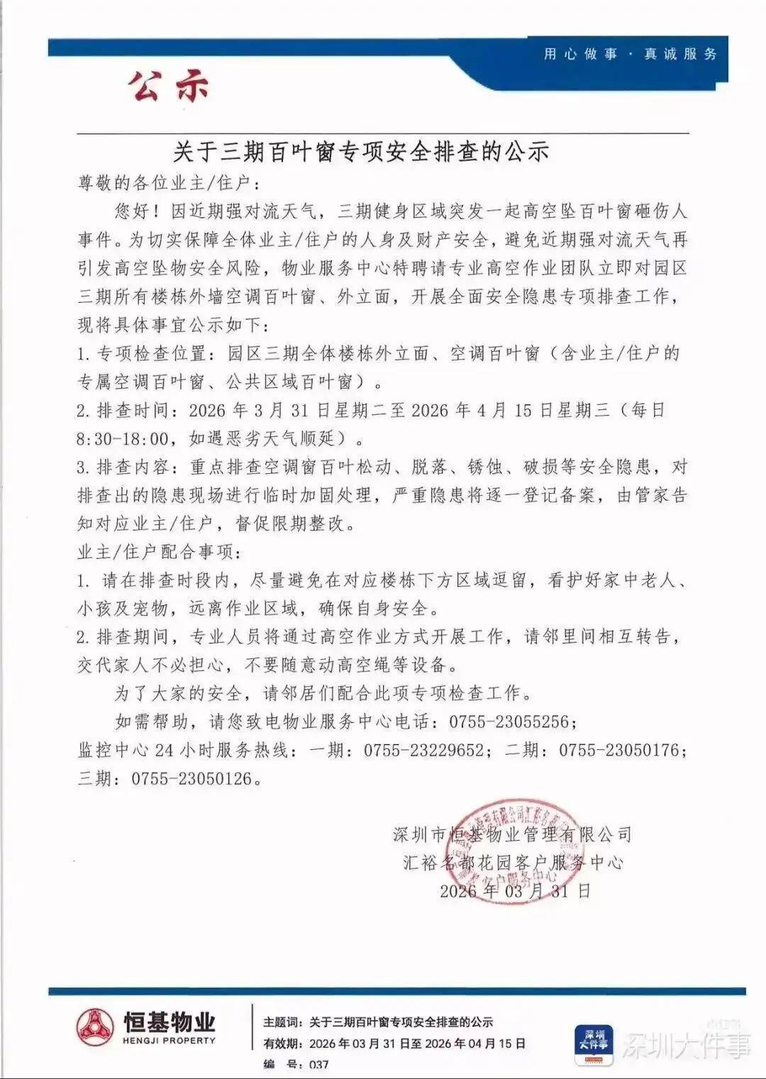 事件当日,涉事物业—深圳市恒基物业管理有限公司发布了《关于三期百叶窗专项安全排查的公示》。当中明确提到:因近期强对流天气,三期健身区域突发一起高空坠百叶窗砸伤人事件。为避免再引发高空坠物安全风险,物业服务中心特聘请专业高空作业团队立即对园区三期所有楼栋外墙空调百叶窗,外立面,开展全面安全隐患专项排查工作。其中,将重点排查空调窗百叶松动,脱落,锈蚀,破损等安全隐患,对排查出的隐患现场进行临时加固处理。