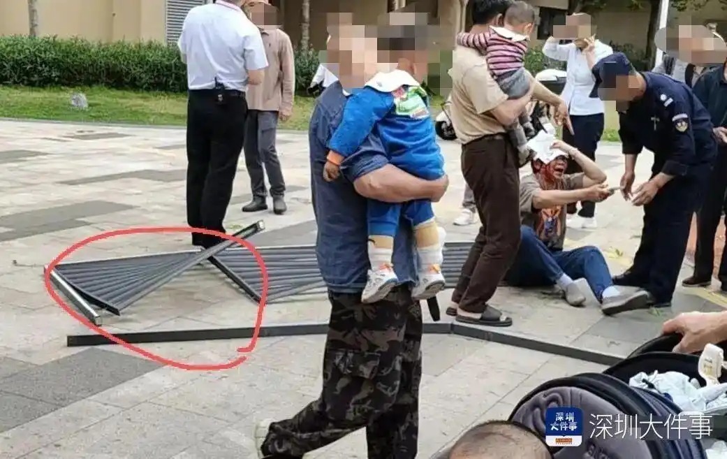 网友发布的照片显示,现场一块长约2米的黑色金属百叶窗坠地后框架变形、叶片散落。一名老年人坐在地上,头部有明显血迹,神情痛苦,身旁有安保人员上前救助,现场聚集了不少业主。记者注意到,帖子留言中,有网友还原了部分细节:“老太太还活着,真的捡回来一条命了,太恐怖了”“人家奶奶还推着她家小婴儿的,幸好宝宝没事”。
